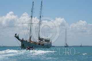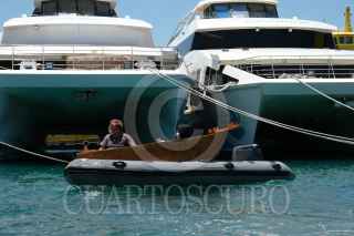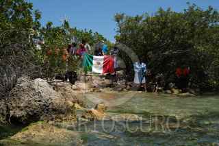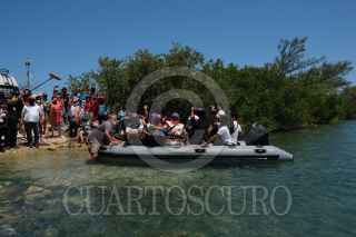 ISLA MUJERES, QUINTANA ROO, 30ABRIL2021.- La delegación marítima del Ejército Zapatista de Liberación Nacional arribó al puerto a medio día. Ya con su equipaje tomaron una lancha que los llevó al barco La Montaña donde viajaran hasta el continente Europeo con el objetivo de compartir su lucha y de esta forma encontrarse con otras. Durante más de seis semanas los siete zapatistas cruzarán el océano para anclar en un puerto español continuando sus denuncias, aprendizajes y formas organizativas con otros. FOTO: ISABEL MATEOS/CUARTOSCURO.COM