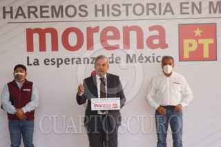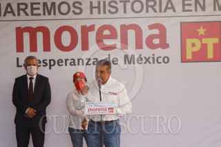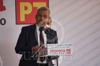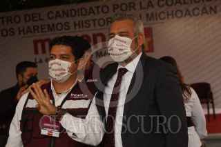MORELIA, MICHOACÁN. 01MAYO2021. Alfredo Ramírez Bedolla, se registró ante el Instituto Electoral de Michoacán como candidato a la gobernatura del estado por Morena y PT. Al medio día la calle del Instituto lucía llena de gente que acompaño a Bedolla, dentro del lugar, liderazgos de los dos partidos así como Raúl Morón estuvieron presentes durante el registro. Durante su discurso, Ramírez Bedolla abordó el tema de la corrupción en los gobiernos y llamó a la unidad a su partido para así llegar a la gobernatura en Michoacán. FOTO: JUAN JOSÉ ESTRADA SERAFÍN /CUARTOSCURO.COM
