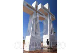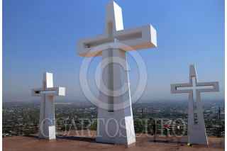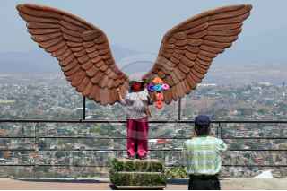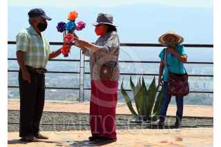 TEMIXCO, MORELOS, 03MAYO2021.- Hoy se celebra el día de la Santa Cruz o día del albañil, sin embargo, la pandemia de Covid-19 no permitió que se celebraran misas en las iglesias. En la imagen una familia acude al mirador de Tres Cruces con una cruz de madera adornada con flores de papel y rosarios. FOTO: MARGARITO PÉREZ RETANA /CUARTOSCURO.COM