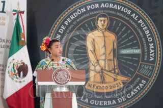 FELIPE CARRILLO PUERTO, QUINTANA ROO, 03MAYO2021.- Andrés Manuel López Obrador, Presidente de México, encabezó la "Petición de perdón por agravios al pueblo maya. Fin de la Guerra de Castas". Acompañaron al mandatario: Alejandro Eduardo Giammattei Falla, Presidente de la República de Guatemala; Carlos Manuel Joaquín González, Gobernador del Estado de Quintana Roo; Ana Karen Dzib Poot, Representante del Pueblo Maya; Olga María Sánchez Cordero, Secretaria de Gobernación; Pedro Bolo Vila, Ministro de Relaciones Exteriores de Guatemala; Marcelo Ebrard Casaubón, Secretario de Relaciones Exteriores; Luis Cresencio Sandoval González, Secretario de la Defensa Nacional; José Rafael Ojeda Durán, Secretario de Marina; Alejandra Frausto Guerrero, Secretaria de Cultura; Zoé Robledo Aburto, Presidente de la Comisión Presidencial para la Conmemoración de Hechos, Procesos y Personajes Históricos de México; Adelfo Regino Montes, Director General del Instituto Nacional de los Pueblos Indígenas y José Esquivel Vargas, Presidente Municipal de Felipe Carrillo Puerto. FOTO: PRESIDENCIA/CUARTOSCURO.COM