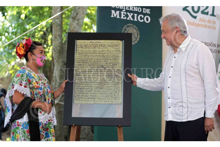 FELIPE CARRILLO PUERTO, QUINTANA ROO, 03MAYO2021.- Andrés Manuel López Obrador, Presidente de México, encabezó la "Petición de perdón por agravios al pueblo maya. Fin de la Guerra de Castas". Acompañaron al mandatario: Alejandro Eduardo Giammattei Falla, Presidente de la República de Guatemala; Carlos Manuel Joaquín González, Gobernador del Estado de Quintana Roo; Ana Karen Dzib Poot, Representante del Pueblo Maya; Olga María Sánchez Cordero, Secretaria de Gobernación; Pedro Bolo Vila, Ministro de Relaciones Exteriores de Guatemala; Marcelo Ebrard Casaubón, Secretario de Relaciones Exteriores; Luis Cresencio Sandoval González, Secretario de la Defensa Nacional; José Rafael Ojeda Durán, Secretario de Marina; Alejandra Frausto Guerrero, Secretaria de Cultura; Zoé Robledo Aburto, Presidente de la Comisión Presidencial para la Conmemoración de Hechos, Procesos y Personajes Históricos de México; Adelfo Regino Montes, Director General del Instituto Nacional de los Pueblos Indígenas y José Esquivel Vargas, Presidente Municipal de Felipe Carrillo Puerto. FOTO: PRESIDENCIA/CUARTOSCURO.COM