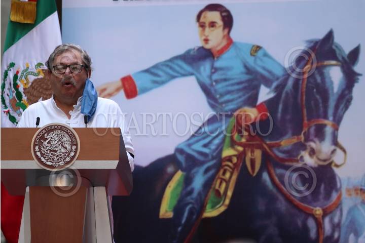 CIUDAD DE MÉXICO, 05MAYO2021.- Paco Ignacio Taibo II, director del Fondo de Cultura Económica; Andrés Manuel López Obrador, presidente de México, y Luis Cresencio Sandoval, secretario de la Defensa Nacional encabezaron la ceremonia con motivo del 159 Aniversario de la Batalla de Puebla, en Palacio Nacional. FOTO: GALO CAÑAS/CUARTOSCURO.COM