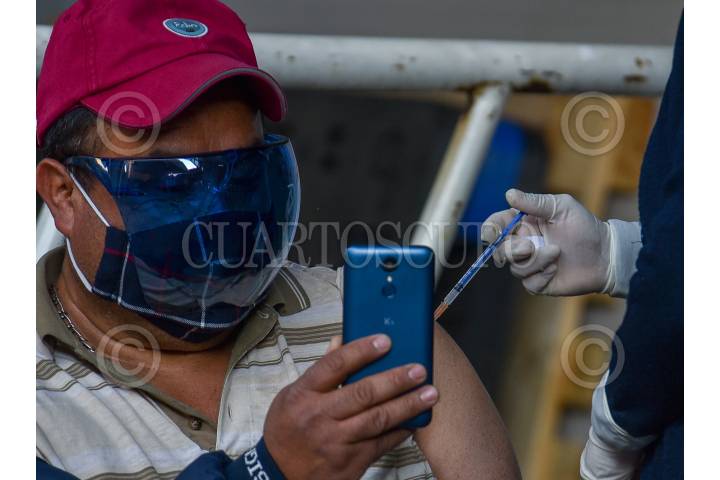 TOLUCA, ESTADO DE MÉXICO, 05MAYO2021.- Este miércoles dio inicio la vacunación contra COVID-19 para personas de 50 a 59 años en Toluca, desde temprana ahora se dieron cita en el Estadio Nemesio Diez uno de los 4 centros de vacunación en este municipio para recibir la primera dosis de la vacuna de BioNTech Pfizer, muchos tomaron la fotografía del recuerdo con sus celulares para poderla compartir en sus redes sociales. FOTO: CRISANTA ESPINOSA AGUILAR /CUARTOSCURO.COM