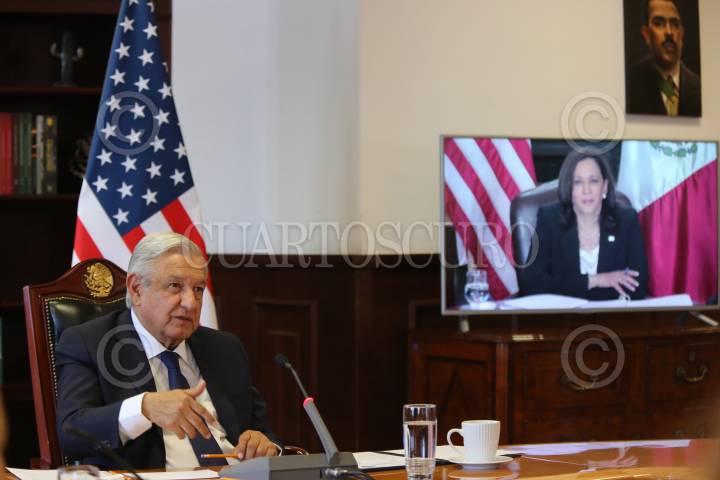 CIUDAD DE MÉXICO, 07MAYO2021.- Andrés Manuel López Obrador, presidente de México, sostuvo una reunión vía remota con la vicepresidenta de Estados Unidos Kamala Harris en donde abordaron el trabajo conjunto que deben sostener para combatir la violencia y la corrupción. Asimismo, se conversó entorno al programa Sembrando Vida, iniciativa de la actual administración, que debería conducir a la obtención de visas estadounidenses para los beneficiarios. FOTO: PRESIDENCIA/CUARTOSCURO.COM