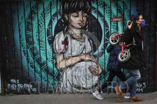 CIUDAD DE MÉXICO, 08MAYO2021.- Una madre carga la bicicleta de su hija, mientras ella camina a su lado, frente a un mural de una mujer embarazada, esto en la alcaldía Magdalena Contreras. FOTO: ROGELIO MORALES /CUARTOSCURO.COM