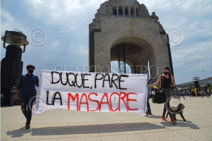 CIUDAD DE MÉXICO, 08MAYO2021.- Decenas de colombianos realizaron actividades culturales sobre la explanada del monumento a la Revolución, en apoyo al Paro Nacional en su país en el que movimientos sociales protestan contra la reforma tributaria y el rechazo al abuso de las autoridades. FOTO: MARIO JASSO/CUARTOSCURO.COM