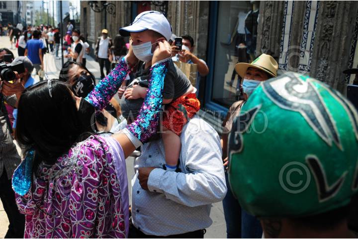 CIUDAD DE MÉXICO, 10MAYO2021.- Luchadores del Consejo Mexicano de Lucha Libre a través del Injuve, realizaron un recorrido por la calle de Madero para colocar Cubrebocas a transeúntes que no lo llevarán puesto, esto con el objetivo de seguir consientizando a los capitalinos con el uso de este objeto para prevenir contagios de Covid-19. FOTO: DANIEL AUGUSTO /CUARTOSCURO.COM