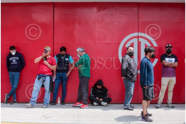 TOLUCA, ESTADO DE MÉXICO, 11MAYO2021.- Aficionados a los Diablos Rojos del Toluca se dieron cita en el Estadio Nemesio Diez para conseguir boletos para el encuentro de este miércoles ante la escuadra de la Máquina de Cruz Azul partido de ida de Cuartos de Final de la Liguilla del Clausura 2021 de la Liga MX, no importó esperar varias horas en el sol e incluso bajo la lluvia que se registró la tarde de este martes, que serán abiertas las puertas al público con un aforo del 25 por ciento de su capacidad al permanecer la entidad mexiquense en semáforo epidemiológico color amarillo. FOTO: CRISANTA ESPINOSA AGUILAR /CUARTOSCURO.COM