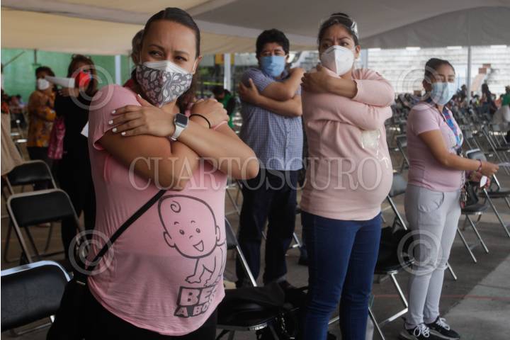 CIUDAD DE MÉXICO, 12MAYO2021.- Mujeres embarazadas acudieron a recibir su primera dosis de vacuna P-fizer contra Covid-19 en la Escuela Primaria Benito Juárez, en la alcaldía Cuauhtémoc. Ana Paola, de 32 años con 30 semanas de gestación; Elena Domínguez, de 33 años, con 32 semanas y Estefania Ruiz, de 22 años, con 22 semanas de embarazada, fueron observadas durante veinte minutos después de ser vacunadas. FOTO: GRACIELA LÓPEZ /CUARTOSCURO.COM