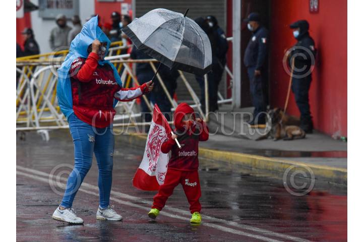 TOLUCA, ESTADO DE MÉXICO, 12MAYO2021.- El encuentro entre Los Diablos Rojos del Toluca y la Máquina de Cruz Azul partido de ida de Cuartos de Final de la Liguilla del Torneo Guardianes Clausura 2021, pudo realizarse con público en el Estadio Nemesio Diez, al estar en semáforo epidemiológico color amarillo en el estadio Nemesio Diez; toma de temperatura, gel antibacterial, lugares separados fueron algunas de las medidas para que los aficionados pudieran entrar al estadio después de más de un año de permanecer cerrado y no poder disfrutar de este tipo de eventos a causa de la pandemia por COVID-19. FOTO: CRISANTA ESPINOSA AGUILAR /CUARTOSCURO.COM