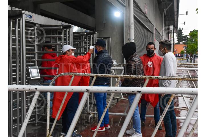 TOLUCA, ESTADO DE MÉXICO, 12MAYO2021.- El encuentro entre Los Diablos Rojos del Toluca y la Máquina de Cruz Azul partido de ida de Cuartos de Final de la Liguilla del Torneo Guardianes Clausura 2021, pudo realizarse con público en el Estadio Nemesio Diez, al estar en semáforo epidemiológico color amarillo en el estadio Nemesio Diez; toma de temperatura, gel antibacterial, lugares separados fueron algunas de las medidas para que los aficionados pudieran entrar al estadio después de más de un año de permanecer cerrado y no poder disfrutar de este tipo de eventos a causa de la pandemia por COVID-19. FOTO: CRISANTA ESPINOSA AGUILAR /CUARTOSCURO.COM