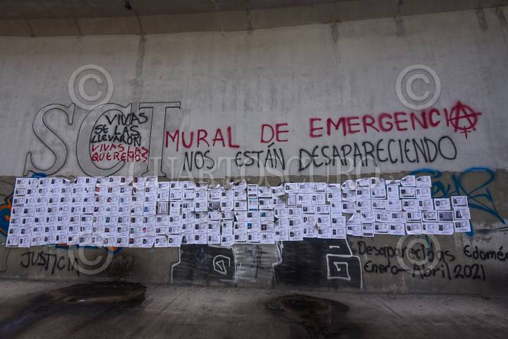 TOLUCA, ESTADO DE MÉXICO, 13MAYO2021.- Integrantes del colectivo Mujeres entre las Cebollas realizaron un mural de emergencia en donde colocaron fichas de búsqueda de mujeres que han desaparecido en el Estado de México en los meses de enero a abril del 2021 en el distribuidor vial de la Carretera Toluca Naucalpan, acompañado por las leyendas “Mural de Emergencia, Nos Están Desapareciendo” FOTO: CRISANTA ESPINOSA AGUILAR /CUARTOSCURO.COM