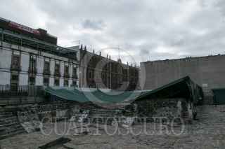 CIUDAD DE MÉXICO, 14MAYO2021.- A dos semanas de la granizada que provocó el derrumbe del techo del Templo de las Águilas, los trabajos continúan aunque sin un avance significativo, una parda provisional fue instalada y el acceso al recinto permanece cerrado al público. FOTO: GALO CAÑAS/CUARTOSCURO.COM