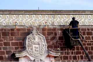 AGUASCALIENTES, AGS. 22AGOSTO2006.- Un empleado instala la iluminación que el Palacio de Gobierno lucirá durante septiembre, con motivo de las Fiestas Patrias. FOTO: Juan Manuel Robledo/CUARTOSCURO.COM