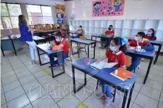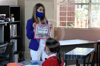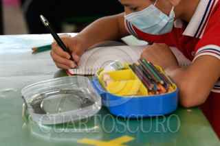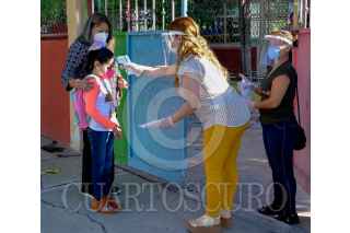 SALTILLO, COAHUILA, 17MAYO2021.- 70 escuela de educación básica regresaron a clases presenciales luego de que este estado entrará a semáforo verde de la alerta epidemiológica por el Covid-19. Se estima que hoy regresaron alrededor 19 mil alumnos a las aulas, entre las medidas sanitarias pertinentes; como el uso de gel antibacterial, la medición de temperatura, el uso de cubrebocas, y la sana distancia. Esta iniciativa forma parte de un plan piloto que contempla la asistencia reducida de alumnos, entre 8 y 10 estudiantes por salón, y sólo estarán media jornada escolar. FOTO: ALEJANDRO RODRÍGUEZ/CUARTOSCURO.COM