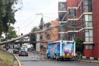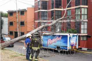 CIUDAD DE MÉXICO, 18MAYO2021.- Un árbol cayó sobre unos cables de alta tensión debido a los fuertes vientos y la intensa lluvia que se vivió esta tarde en la capital. Los hechos en carriles laterales de avenida Río Churubusco y la calle de Aries, en la colonia Campestre Churubusco. FOTO: CRISTIAN HERNÁNDEZ/CUARTOSCURO.COM