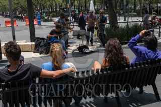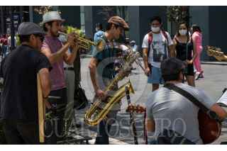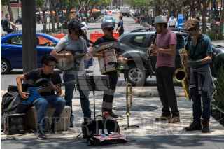 CIUDAD DE MÉXICO, 19MAYO2021.- Una banda de jazz ofrece sus notas musicales a los transeúntes de avenida Juárez. FOTO: MOISÉS PABLO/CUARTOSCURO.COM