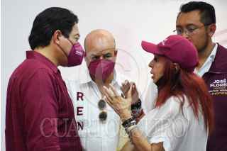 CAMPECHE, CAMPECHE, 21MAYO2021.- Mario Delgado Carrillo, dirigente nacional de Morena, acompañado por Layda Sansores San Román, candidata a la gubernatura de Campeche, y Renato Sales Heredia, candidato a la presidencia municipal, ofrecieron una conferencia de prensa para denunciaron al candidato de Movimiento Ciudadano a la gubernatura del estado, Eliseo Fernández Montufar, por misoginía y corrupción. El equipo de Morena dio a conocer que ya fue denunciado ante la fiscalía especializada en combate a la corrupción por los delitos de defraudación fiscal y facturación falsa de empresas. Mario Delgado comentó que “el candidato de Movimiento Ciudadano es un estafador y un estafador no puede ser gobernador”. Por último, afirmó que pronto llegara la transformación en Campeche de la mano con Layda Sansores. FOTO: MICHAEL BALAM/CUARTOSCURO.COM