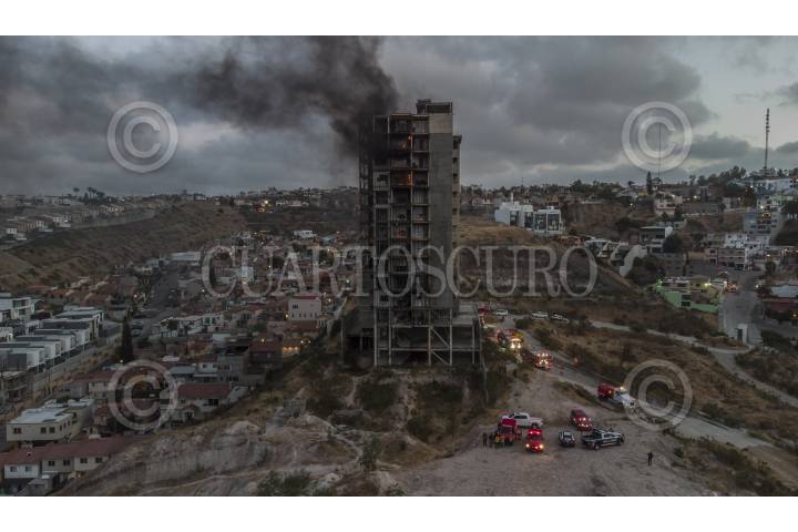 TIJUANA, BAJA CALIFORNIA, 20MAYO2021.- Un incendio se registró en un edificio abandonado de catorce pisos que se encuentra ubicado en la calle Olivos del fraccionamiento Los Olivos. Al lugar acudieron tres estaciones de bomberos para intentar sofocar el incendio. El siniestro causo una columna de hubo que se pudo apreciar desde distintas partes de la ciudad. Se desconocen las causas que pudieron provocarlo. FOTO: OMAR MARTÍNEZ /CUARTOSCURO.COM