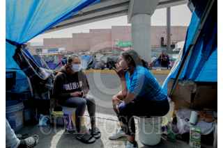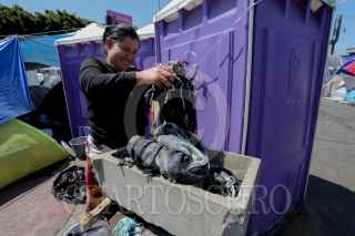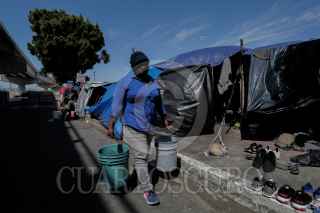 TIJUANA, BAJA CALIFORNIA, 22MAYO2021.- En la garita Internacional de “El Chaparral” en Tijuana, Baja California, hay 2 mil migrantes centroamericanos hacinados esperando que su proceso de asilo avance. En febrero de este año, eran apenas 100 los que acamparon. Tras meses de dormir a la intemperie y exponerse a diversos peligros como: robos, deportaciones o violencia, los migrantes han girado sus esfuerzos en consolidar una comunidad que comparte todo. Cocinan y asean en conjunto, han formado escuelas e incluso dividieron el campamento en una avenida principal con calles aledañas. En tiempos de pandemia, los dos millares de personas, que esperan la resolución a su estatus migratorio, se han organizado para utilizar una única, y exclusiva, llave de agua para satisfacer sus necesidades básicas. FOTO: (COLABORACIÓN ESPECIAL) GLOCAL MEDIA /LISBETH CHÁVEZ /CUARTOSCURO.COM