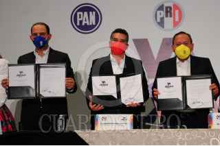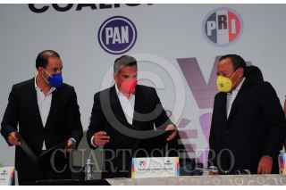 CIUDAD DE MÉXICO, 24MAYO2021.- Los dirigentes nacionales del PRI, PAN y PRD, Alejandro Moreno, Marko Cortés y Jesús Zambrano y que a la vez encabezan la alianza Va Por México, firmaron un acuerdo para realizar una alianza legislativa dentro de la Cámara de Diputados y Senadores para hacer un contrapeso al partido Morena dentro de estos recintos. FOTO: DANIEL AUGUSTO /CUARTOSCURO.COM