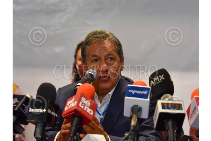 TOLUCA, ESTADO DE MÉXICO, 24MAYO2021.- Los senadores de MORENA Higinio Martínez Miranda y Martha Guerrero Sánchez acompañaron en conferencia de prensa al candidato de la coalición Juntos Haremos Historia Juan Rodolfo Sánchez Gómez, en donde exigieron que el Gobierno del Estado de México saque las manos del proceso electoral, asegurando que al menos tres secretarios estales están trabajando en levantar la campaña del abanderado de la coalición Va por el Estado de México en Toluca. FOTO: CRISANTA ESPINOSA AGUILAR /CUARTOSCURO.COM