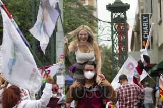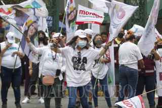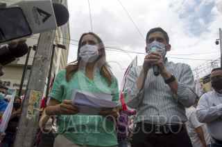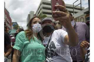 MONTERREY, NUEVO LEÓN, 24MAYO2021.- Clara Luz Flores, candidata a la gubernatura de Nuevo León por MORENA, acudió al centro de la ciudad con Felipe de Jesús Cantú, candidato a la alcaldía de Monterrey para hablar sobre la regeneración del centro de Monterrey y convivir con simpatizantes. FOTO: GABRIELA PÉREZ MONTIEL / CUARTOSCURO.COM