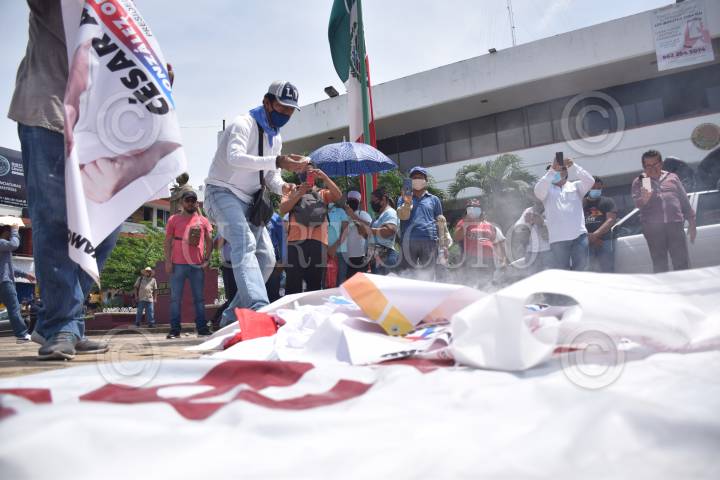 TAPACHULA, CHIAPAS, 26MAYO2021.- Presuntos normalistas marcharon en Tapachula y bajaron la publicidad de los candidatos, piden la liberación de sus compañeros detenidos de la Escuela Normal Rural Mactumactza. Ervin Herrera Estudillo, secretario de la organización 5 de la Costa Grande de la Sección 7 de la CNTE; durante una rueda de prensa espontanea en el Parque Miguel Hidalgo de Tapachula, señaló que este miércoles se manifestaron en las calles para dejar en evidencia al actual gobierno y a los legisladores de la Cámara de Diputados, ante los hechos ocurridos en la Escuela Normal Rural Mactumactza. Durante su manifestación y recorrido por las calles de Tapachula, los presuntos normalistas quitaron las lonas de candidatos que forman parte de sus campañas políticas y en la explanada del Parque prendieron fuego a estas lonas. FOTO: DAMIÁN SÁNCHEZ/CUARTOSCURO.COM