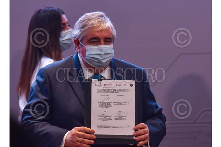 TOLUCA, ESTADO DE MÉXICO, 28MAYO2021.- El Magistrado Ricardo Sodi Cuellar, Presidente del Tribunal Superior de Justicia del Estado de México, Laura Alicia Cano Ruíz Directora Ejecutiva de la Confraternidad Carceleraria de México A. C., Eduardo Verástegui, filántropo y actor, Gregorio Poblano Bata, responsable Diocesano de la Dimensión de Pastoral Penitenciaria de la Arquidiócesis de Toluca, firmaron el Convenio de Concertación para la Reinserción Social de Adolescentes Privados de la Libertad. FOTO: CRISANTA ESPINOSA AGUILAR /CUARTOSCURO.COM