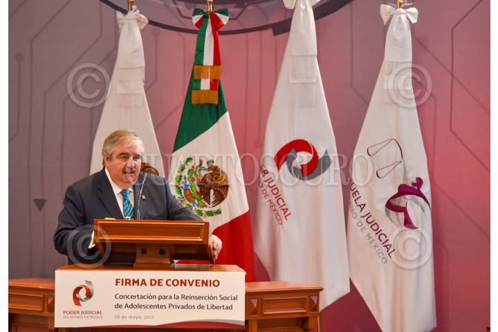 TOLUCA, ESTADO DE MÉXICO, 28MAYO2021.- El Magistrado Ricardo Sodi Cuellar, Presidente del Tribunal Superior de Justicia del Estado de México, Laura Alicia Cano Ruíz Directora Ejecutiva de la Confraternidad Carceleraria de México A. C., Eduardo Verástegui, filántropo y actor, Gregorio Poblano Bata, responsable Diocesano de la Dimensión de Pastoral Penitenciaria de la Arquidiócesis de Toluca, firmaron el Convenio de Concertación para la Reinserción Social de Adolescentes Privados de la Libertad. FOTO: CRISANTA ESPINOSA AGUILAR /CUARTOSCURO.COM