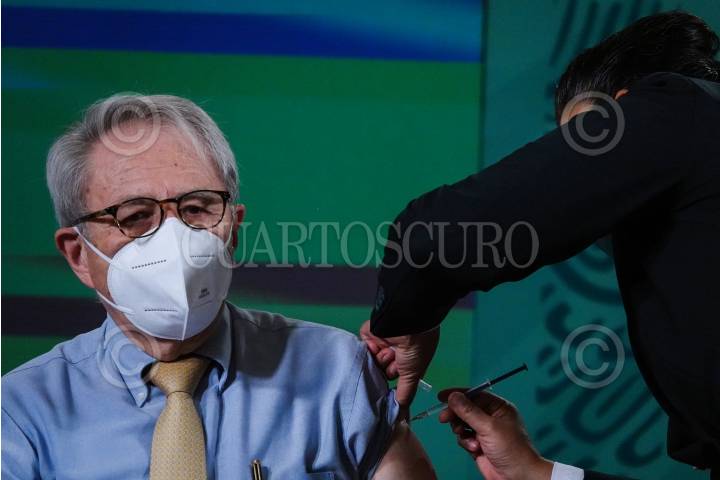 CIUDAD DE MÉXICO, 01JUNIO2021.- Jorge Alcocer, secretario de Salud, fue vacunado con la segunda dosis de la vacuna AstraZeneca contra Covid-19 al termino de la conferencia matutina del presidente Andrés Manuel López Obrador. El secretario invitó a la población a continuar acudiendo a los módulos y no bajar la guardia contra la pandemia. FOTO: GALO CAÑAS/CUARTOSCURO.COM