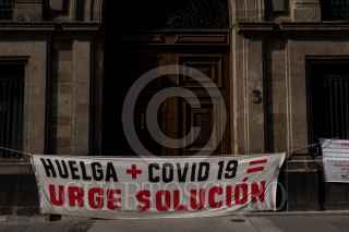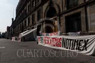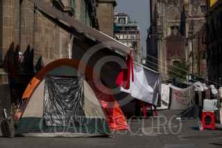 CIUDAD DE MÉXICO, 01JUNIO2021.- Ex trabajadores de la Agencia de Noticias del Estado Mexicano (NOTIMEX), afiliados al Sindicato Único de Trabajadores de Notimex (SUTNotimex), permanecen en campamento frente al acceso de Palacio Nacional, ubicado en la calle de Moneda, en exigencia de justicia y atención a la huelga que han sostenido por más de un año. El pasado 30 de mayo, se dio a conocer que quienes participan en el plantón fueron amenazados de muerte mientras sostenían guardia. FOTO: GALO CAÑAS/CUARTOSCURO.COM