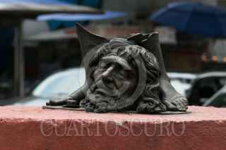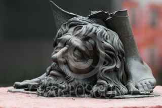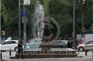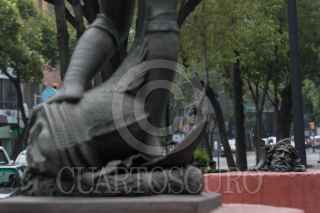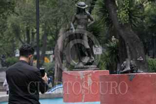 CIUDAD DE MÉXICO, 01JUNIO2021.- La estatua de bronce de "El David del artista Andres del Verrocchio" fue robada por dos sujetos el 22 de mayo, la pieza estaba colocada en una fuente de avenida Álvaro Obregón, a la altura de la calle de Medellín, vecinos reportaron su ausencia lo que alertó a las autoridades, la policía detuvo a un sujeto que supuestamente participó en el hurto cuando intentaba robar otra estatua el 30 de mayo. Hasta el momento se desconoce el paradero de estatua. Curiosos que pasan por el sitio le toman fotos a la cabeza y los pies de bronce que los ladrones no se pudieron llevar. FOTO: MOISÉS PABLO/CUARTOSCURO.COM