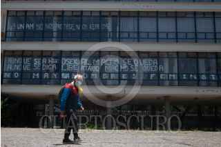 CIUDAD DE MÉXICO, 01JUNIO2021.- Un señor camina enfrente de los salones con pintas feministas de la Facultad de Flosofía y Letras, en Ciudad Universitaria. FOTO: GRACIELA LÓPEZ /CUARTOSCURO.COM