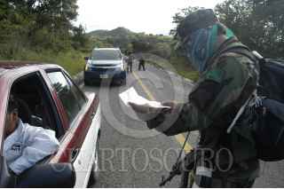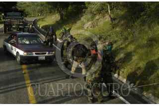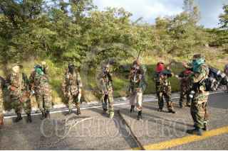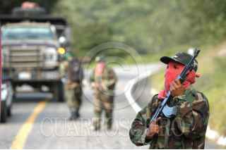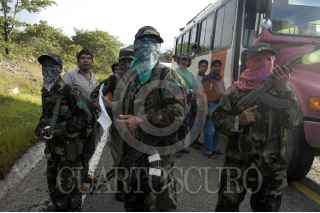 OAXACA 31AGOSTO2006.- Una decena de integrantes del grupo insurgente armando Tendencia Democrática Revolucionaria-Ejército del Pueblo (TDR-EP) realizaron un bloqueo en la carretera Oaxaca-Guelatao para informar la necesidad de establecer un nuevo pacto social de tres puntos: 1.- Desconocer al gobierno espurio que de manera fraudulenta la ultraderecha ha decidido imponer, tal y como lo propone la convocatoria de la Convención Nacional Democrática por el Bien de Todos. 2.- Que contribuya a resolver el grave conflicto oaxaqueño mediante la desaparición de podes como lo exige la Asamblea Popular del Pueblo Oaxaqueño. 3.- Pide la liberación de los presos políticos del país como lo exige el EZLN. La TDR-ER rechaza su participación en el movimiento que realiza la Asamblea Popular del Pueblo Oaxaqueño. Las organizaciones revolucionarias armadas se mantendrán en estado de alerta para respuestas contundentes en caso de que las fuerzas de seguridad nacional pretendan intervenir en el conflicto magisterial. En la tarde ayer una decenas de personas armadas con rifles AK-47 bloquearon por 20 minutos la circulación de automóviles y repartieron información sobre su movimiento armado. Con esta acción los integrantes de la Tendencia Democrática Revolucionaria-Ejército del Pueblo (TDR-EP) recordaron la aparición del Ejercito Popular Revolucionario el 28 de agosto de 1996. Los uniformados no realizaron ningún disparo en señal de paz. FOTO: Germán Romero/CUARTOSCURO.COM