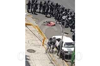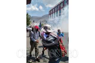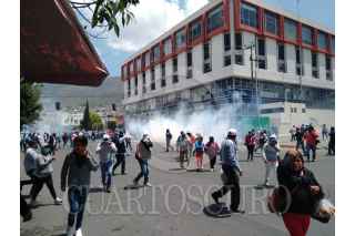 PACHUCA, HIDALGO, 01JUNIO2021.- Pobladores de la comunidad de Xuchitán, en San Salvador, mantenían bloqueada la Avenida Madero a la altura de Palacio de Gobierno, buscando una audiencia con las autoridades estatales para la realización de obras públicas en su comunidad, en su intención de ingresar, policías que resguardan el lugar lanzaron gas lacrimógeno para contener a los manifestantes. FOTO: CUARTOSCURO.COM