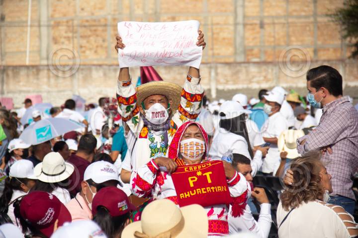 TEPIC, NAYARIT, 02JUNIO2021.- Miguel Ángel Navarro Quintero, candidato a gobernador de Nayarit por la alianza “Juntos Haremos Historia”; conformada por Morena, Partido del Trabajo, Partido Verde Ecologista y Nueva Alianza, cerró su campaña proselitista con un evento masivo en el Recinto Ferial de Tepic. Estuvo acompañado por un representante de grupos vulnerables como, pueblos originarios, personas con capacidades diferentes, jóvenes y comunidad LGBTTTIQ, así como el sector agrícola, ganadero, pesquero, ejidatarios y un representante de la juventud nayarita. También estuvo presente Geraldine Ponce, candidata de la misma coalición a la Presidencia Municipal de Tepic. “Debemos de entender que, Nayarit no es de pocos, es de todos y será tan grande como queremos; tenemos que empezar a reconstruir el ánimo con mucha dignidad y hacerla respetar. Entiéndanlo, somos el estado más rico”, resaltó Navarro Quintero. FOTO: ÁNGEL IBARRA/CUARTOSCURO.COM