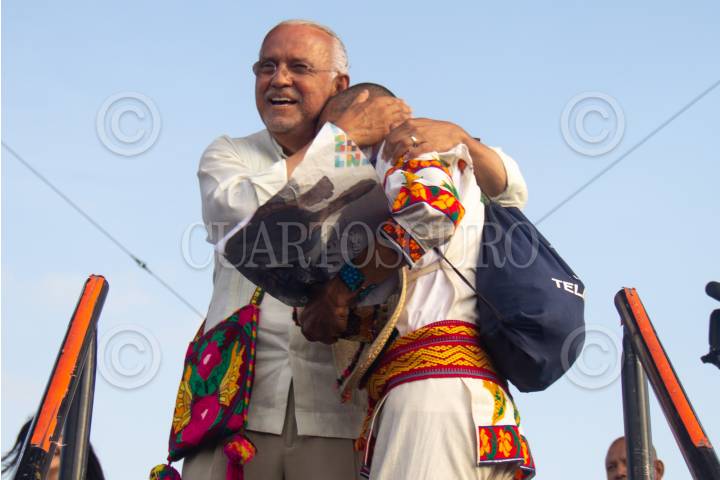 TEPIC, NAYARIT, 02JUNIO2021.- Miguel Ángel Navarro Quintero, candidato a gobernador de Nayarit por la alianza “Juntos Haremos Historia”; conformada por Morena, Partido del Trabajo, Partido Verde Ecologista y Nueva Alianza, cerró su campaña proselitista con un evento masivo en el Recinto Ferial de Tepic. Estuvo acompañado por un representante de grupos vulnerables como, pueblos originarios, personas con capacidades diferentes, jóvenes y comunidad LGBTTTIQ, así como el sector agrícola, ganadero, pesquero, ejidatarios y un representante de la juventud nayarita. También estuvo presente Geraldine Ponce, candidata de la misma coalición a la Presidencia Municipal de Tepic. “Debemos de entender que, Nayarit no es de pocos, es de todos y será tan grande como queremos; tenemos que empezar a reconstruir el ánimo con mucha dignidad y hacerla respetar. Entiéndanlo, somos el estado más rico”, resaltó Navarro Quintero. FOTO: ÁNGEL IBARRA/CUARTOSCURO.COM