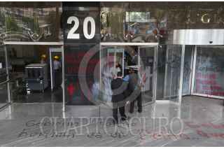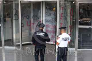 CIUDAD DE MÉXICO, 02JUNIO2021.- Supuestos normalistas de Ayotzinapa y de Mactumatzá lanzaron petardos y realizaron pintas en el acceso principal de la Fiscalía General de la República (FGR), como protesta al no ser recibidos en Palacio Nacional. FOTO: GABINO ACEVEDO/CUARTOSCURO.COM