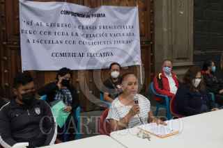 CIUDAD DE MÉXICO, 02JUNIO2021.- Patricia Ledezma, docente de la Universidad Pedagógica Nacional, durante la conferencia en la que estuvieron presentes maestros, estudiantes y padres de familias de diferente niveles educativos e instituciones en donde se pronunciaron por un regreso presencial a clases con condiciones seguras, mismas que ningún plantel tiene. Aseguran que los "filtros de corresponsabilidad" propuestos por la SEP no permiten identificar los casos asintomáticos y, por lo tanto, no evitarán los contagios de Covid-19 de nuestras alumnas y alumnos que después se extenderán a sus familias. El encuentro se realizó en la puerta principal de la SEP, y de fondo se observaba una manta con la leyenda "Sí al regreso a clases presenciales pero con toda la población vacunada, a escuelas con condiciones dignas". FOTO: MOISÉS PABLO/CUARTOSCURO.COM