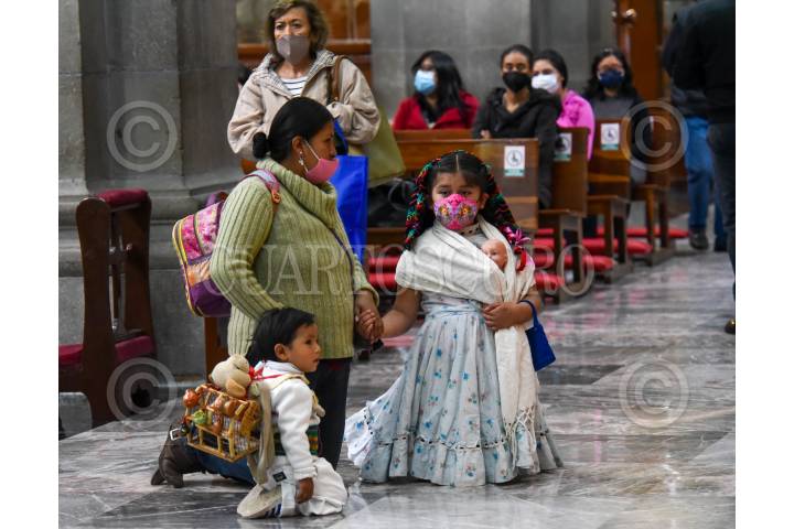 TOLUCA, ESTADO DE MÉXICO, 03JUNIO2021.- Este jueves se llevó a cabo la misa por el Jueves de Corpus Christi en la Catedral de Toluca, en donde fieles católicos acudieron a esta celebración, en comparación a otros años fueron muy pocos los niños que asistieron ataviados de indígenas, así como aquellos que se tomaron la fotografía del recuerdo, representando un muy bajo ingreso para los fotógrafos que se dedican a retratar estas festividades. FOTO: CRISANTA ESPINOSA AGUILAR /CUARTOSCURO.COM