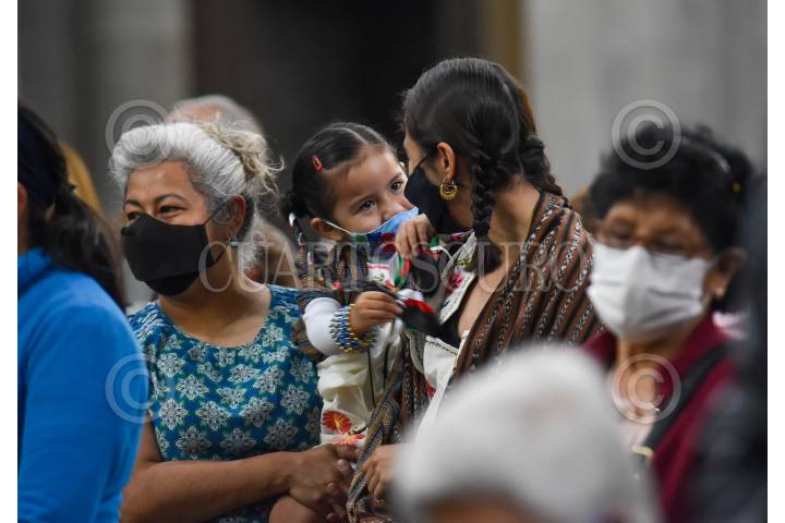 TOLUCA, ESTADO DE MÉXICO, 03JUNIO2021.- Este jueves se llevó a cabo la misa por el Jueves de Corpus Christi en la Catedral de Toluca, en donde fieles católicos acudieron a esta celebración, en comparación a otros años fueron muy pocos los niños que asistieron ataviados de indígenas, así como aquellos que se tomaron la fotografía del recuerdo, representando un muy bajo ingreso para los fotógrafos que se dedican a retratar estas festividades. FOTO: CRISANTA ESPINOSA AGUILAR /CUARTOSCURO.COM