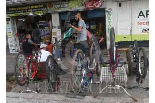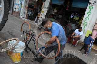 CIUDAD DE MÉXICO, 03JUNIO2021.- El Taller "Avenida", ha ofrecido su servicio desde hace 30 años con servicios de reparación, venta de refacciones y accesorios, como pintura y soldador a eléctrica. El servicio general cuesta $200 pesos y si los bikers o comerciantes con ctriciclo necesitan aire para sus llantas, el costo es de cooperación voluntaria. El Taller Avenida en el que trabajan puros hombres bicicleteros, se encuentra ubicado en Eje Central Lázaro Cárdenas, colonia Doctores, con un horario de lunes a sábado de 9 a 19 horas. La Organización de las Naciones Unidas en 2018 decretó que cada año el 3 de junio se celebraría el Día Mundial de la Bicicleta, con la idea de fomentar su uso como medio de transporte verde así como para conmemorar a un medio de transporte que por varios siglos ha sido el principal para muchos países y comunidades. FOTO: GRACIELA LÓPEZ /CUARTOSCURO.COM