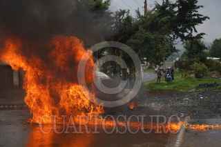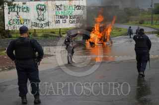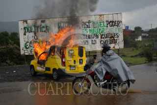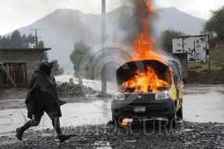 NAHUATZEN, MICHOACÁN, 06JUNIO2021. Como una acción de protesta, comuneros de Arantepacua le prendieron fuego a un vehículo de una empresa de mensajería a las afueras de Nahuatzen. Los comuneros explicaron que no se respetó el acuerdo que tienen como Concejo desde el 2017, que es el rechazo a los partidos políticos y por ende a la no instalación de casillas electorales. Asimismo, denunciaron que han sido amenazados por mismos habitantes de Arantepacua, quienes tienen intereses relacionados con volver al sistema de partidos políticos. FOTO: JUAN JOSÉ ESTRADA SERAFÍN/CUARTOSCURO.COM