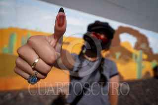 MEXICANLI, BAJA CALIFORNIA, 06JUNIO2021.- Una ciudadana muestra su pulgar con tinta indeleble tras emitir su voto. FOTO: VÍCTOR MEDINA/CUARTOSCURO.COM
