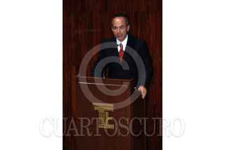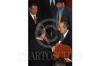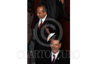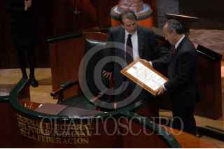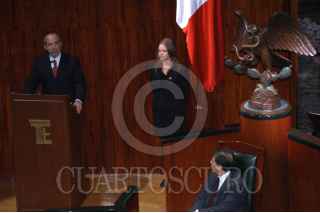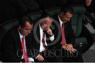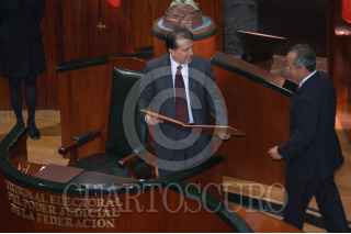 MÉXICO D.F. 06SEPTIMBRE.- Luís Carlos Hugalde, consejero presidente del IFE, Mariano Azuela, presidente de la suprema Corte de Justicia y Carlos Abascal, secretario de gobierno, durante la entrega de constancia de mayoría a Felipe Calderón, que lo avala como presidente de la república a en del Tribunal Federal Electoral. FOTO: GUILLERMO PEREA: CUARTOSCURO.COM