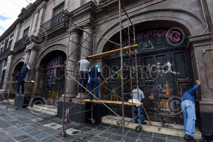 TOLUCA, ESTADO DE MÉXICO, 07JUNIO2021.- Trabajadores de la Cámara de Diputados iniciaron la limpieza de la fachada del recinto legislativo después de casi tres meses de plantón por parte de feministas radicales que exigían se legislará para despenalizar el aborto y en contra de la Ley de Identidad de Género; con diversos líquidos buscan quitar las pintas realizadas y las puertas que fueron quemadas serán reemplazadas. FOTO: CRISANTA ESPINOSA AGUILAR /CUARTOSCURO.COM
