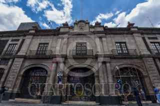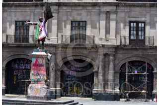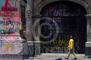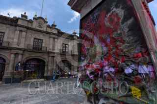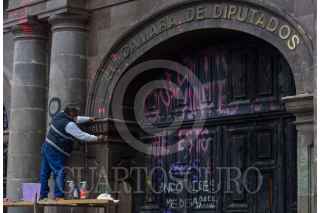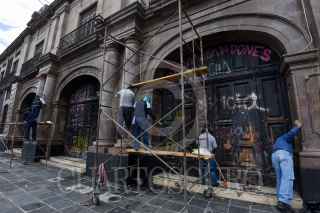TOLUCA, ESTADO DE MÉXICO, 07JUNIO2021.- Trabajadores de la Cámara de Diputados iniciaron la limpieza de la fachada del recinto legislativo después de casi tres meses de plantón por parte de feministas radicales que exigían se legislará para despenalizar el aborto y en contra de la Ley de Identidad de Género; con diversos líquidos buscan quitar las pintas realizadas y las puertas que fueron quemadas serán reemplazadas. FOTO: CRISANTA ESPINOSA AGUILAR /CUARTOSCURO.COM