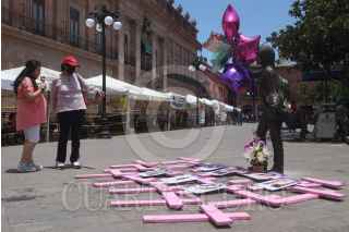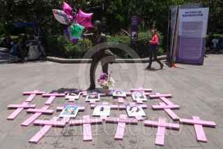 SAN LUIS POTOSÍ, SAN LUIS POTOSÍ, 07JUNIO2021.- Mujeres caminaron frente a unas cruces rosas en honor a las víctimas de feminicidio en este estado, que se encuentran colocadas enfrente de una estatua de una mujer en Plaza de Armas, en el Centro Histórico. El pasado 14 de mayo familiares de víctimas se congregaron en esta Plaza para conmemorar el Día por la Justicia, donde narraron historias de violencia contra las mujeres. FOTO: GRACIELA LÓPEZ /CUARTOSCURO.COM