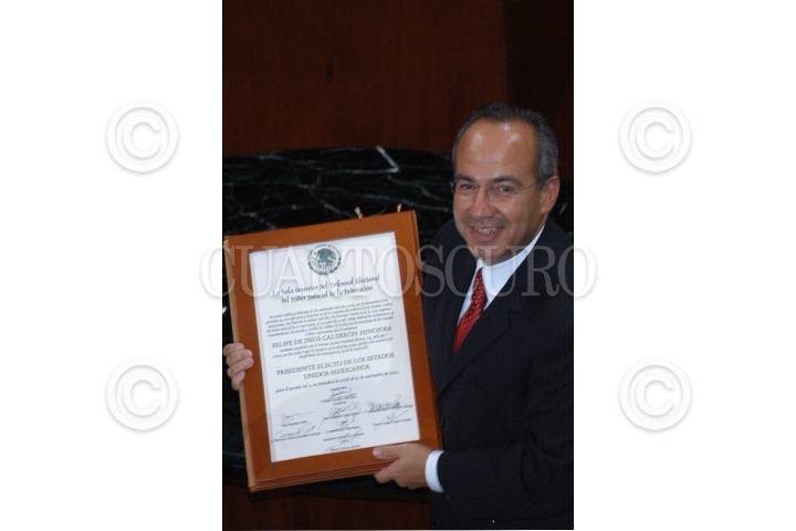 MÉXICO D.F. 06SEPTIMBRE.- Luís Carlos Hugalde, consejero presidente del IFE, Mariano Azuela, presidente de la suprema Corte de Justicia y Carlos Abascal, secretario de gobierno, durante la entrega de constancia de mayoría a Felipe Calderón, que lo avala como presidente de la república a en del Tribunal Federal Electoral. FOTO: GUILLERMO PEREA: CUARTOSCURO.COM